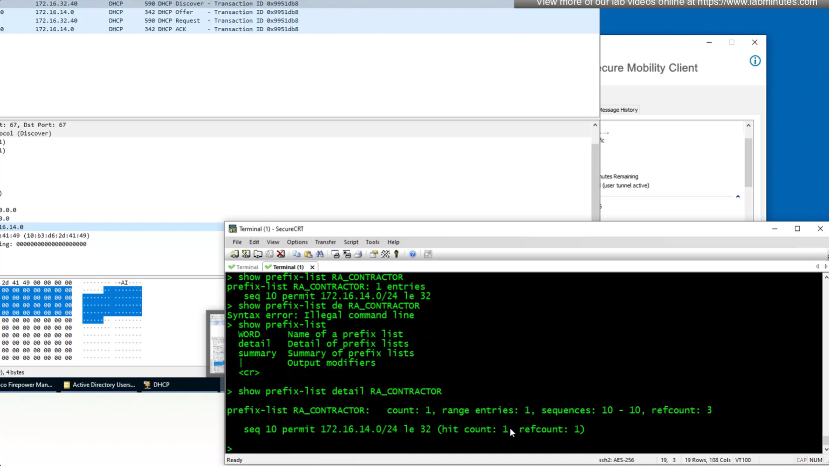 show prefix-list RA_CONTRACTOR show prefix-list detail RA_CONTRACTOR show route static ! shows VPN client , connected V routes
