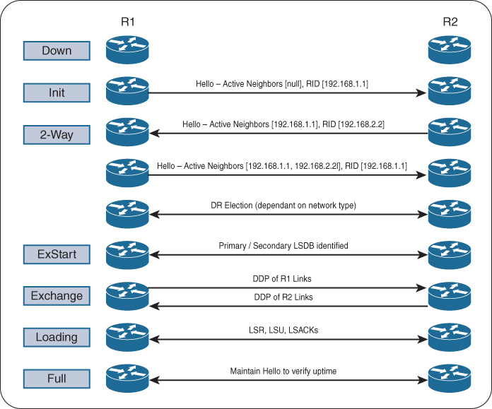 | 2-Way | A state in which bidirectional communication has been established. If a DR or BDR is needed, the election occurs during this state. |
