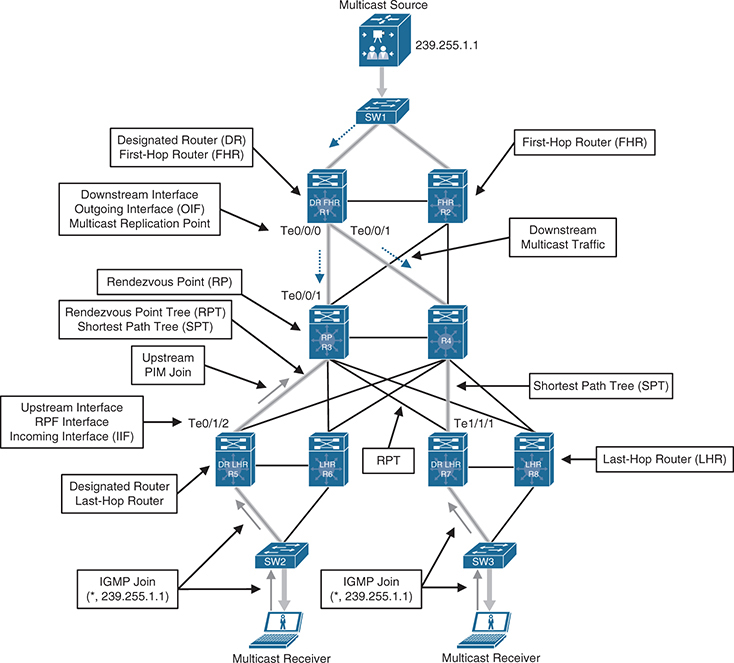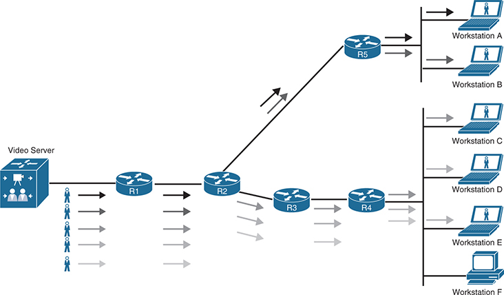 At this point, traffic starts flowing downstream from R1 into R2 and R3, and duplicate packets are then sent out into the LAN and to the receivers.