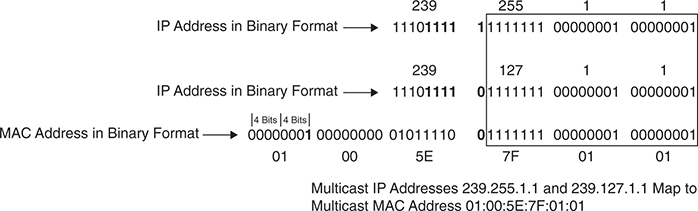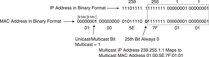 an example of mapping the multicast IP address 239.255.1.1 into the multicast MAC address 01:00:5E:7F:01:01