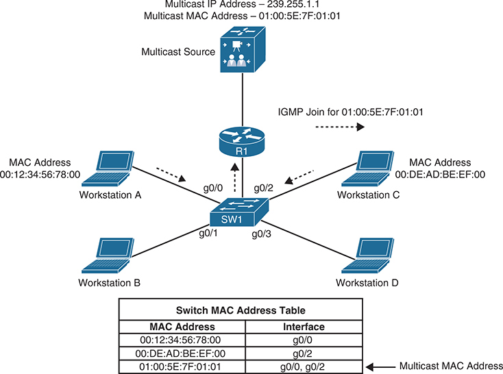 source sending traffic to 239.255.1.1 (01:00:5E:7F:01:01). Switch 1 receives this traffic, and it forwards it out only the g0/0 and g0/2 interfaces because those are the only ports that received IGMP joins for that group.