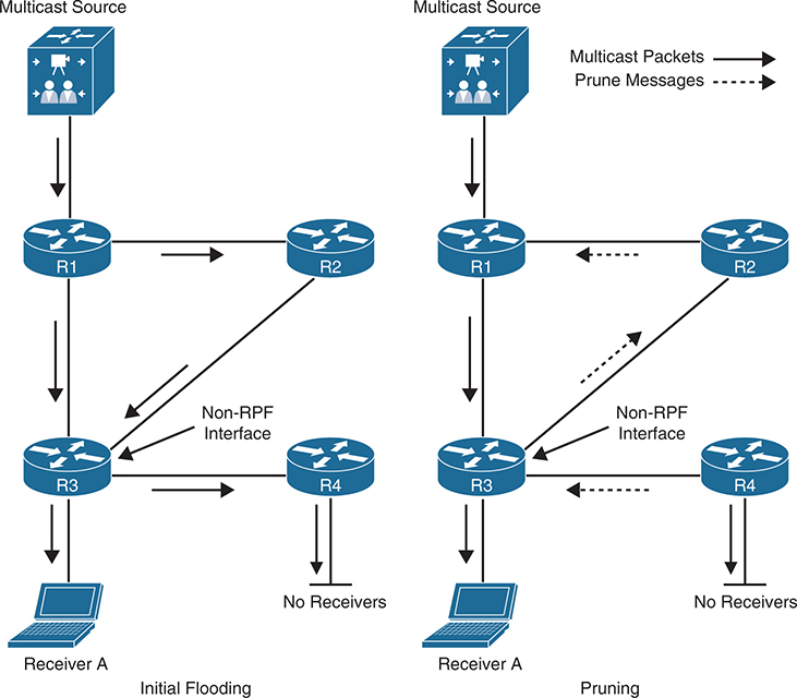 As each router receives the multicast traffic from its upstream neighbor via its RPF interface, it forwards the multicast traffic to all its PIM-DM neighbors, This results in some traffic arriving via a non-RPF interface, as in the case of R3 receiving traffic from R2 on its non-RPF interface. Packets arriving via the non-RPF interface are discarded because it is duplicate traffic and a prune message is prepared