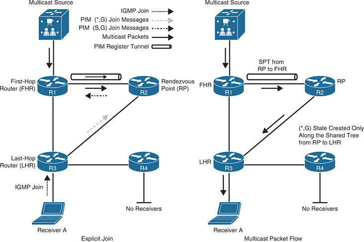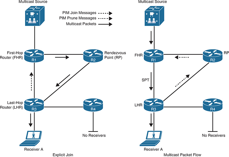 As each router receives traffic for the multicast group, it must decide whether it already has active receivers wanting to receive the multicast traffic. If so, the router remains quiet and lets the multicast flow continue. If no receivers have requested the multicast stream for the multicast group on the LHR, the router sends a prune message toward the source.