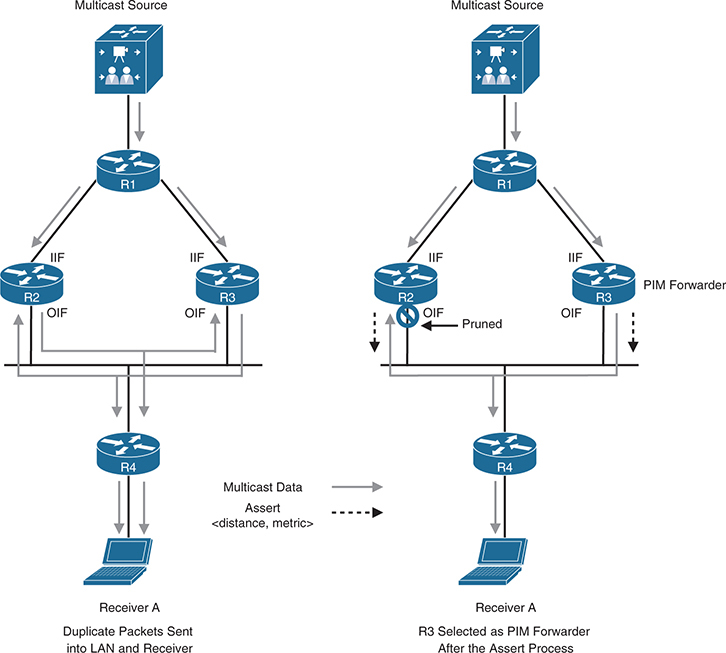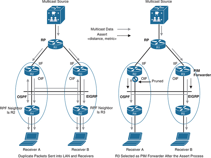 At this point, the PIM assert mechanism kicks in, R3 is elected as the PIM forwarder, and R2’s OIF interface is pruned, as illustrated in the topology on the right side.