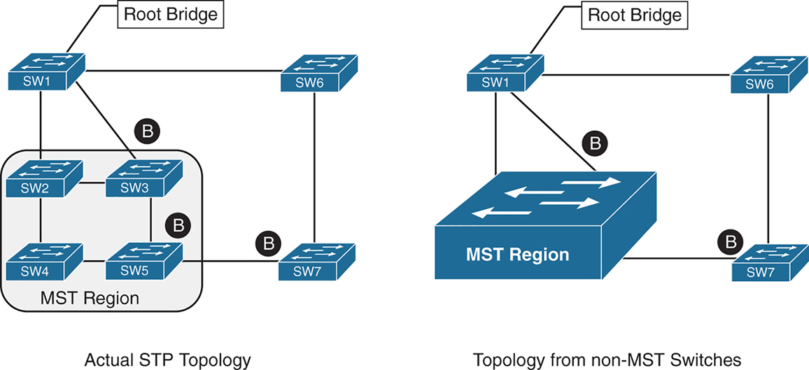 There are two design considerations when integrating an MST region with a PVST+/RPVST environment: The MST region is the root bridge, or the MST region is not a root bridge for any VLAN. These scenarios are explained in the following sections.