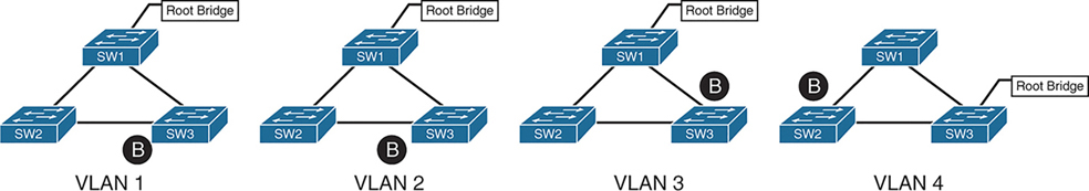 Shortly after implementing the change, users attached to SW1 and SW3 cannot talk to the servers on SW2. The reason is that although the VLANs on the trunk links have changed, the MSTI topology has not.