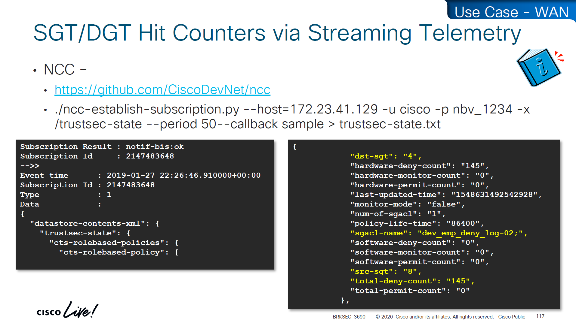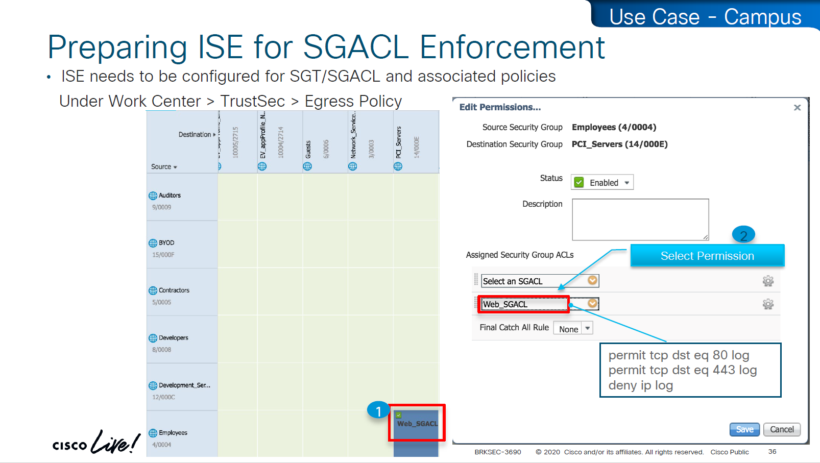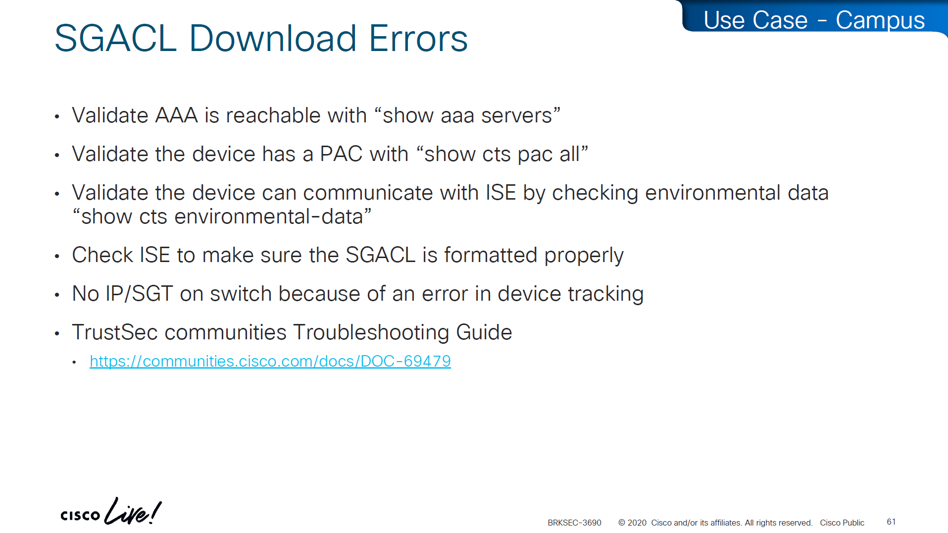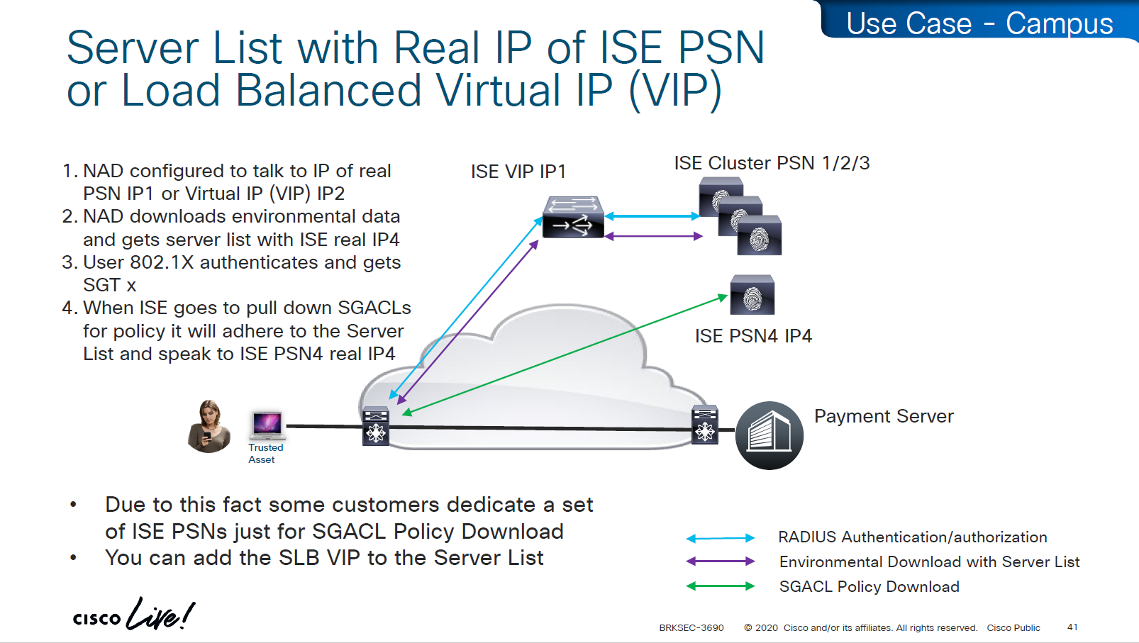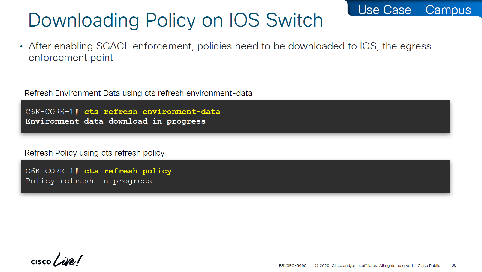 This shows the policy matrix and how switches that have hosts with certain SGT only pull “columns” from matrix for those hosts only, as soon as a host is connected that has a new SGT, policy column for that SGT is downloaded on the switch, this is very on demand like fashion where switch does not have to download all the policies of the policy matrix and be light weight