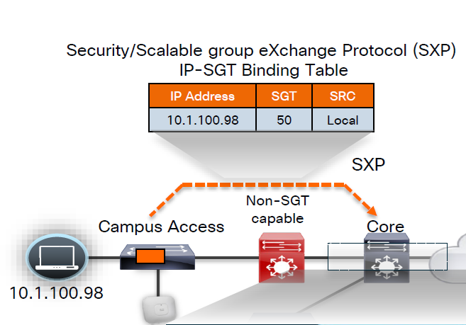 SXP can be activated on a headend only that makes drop or allow policy decisions, it does not have to be applied on all intermediate nodes in the topology hop by hop unlike QoS that requires every hop to do QoS enforcement.