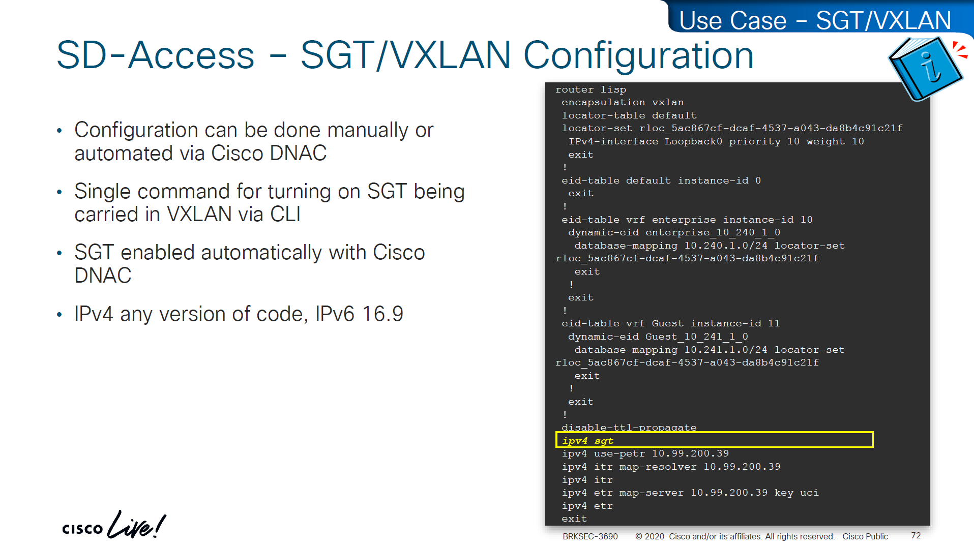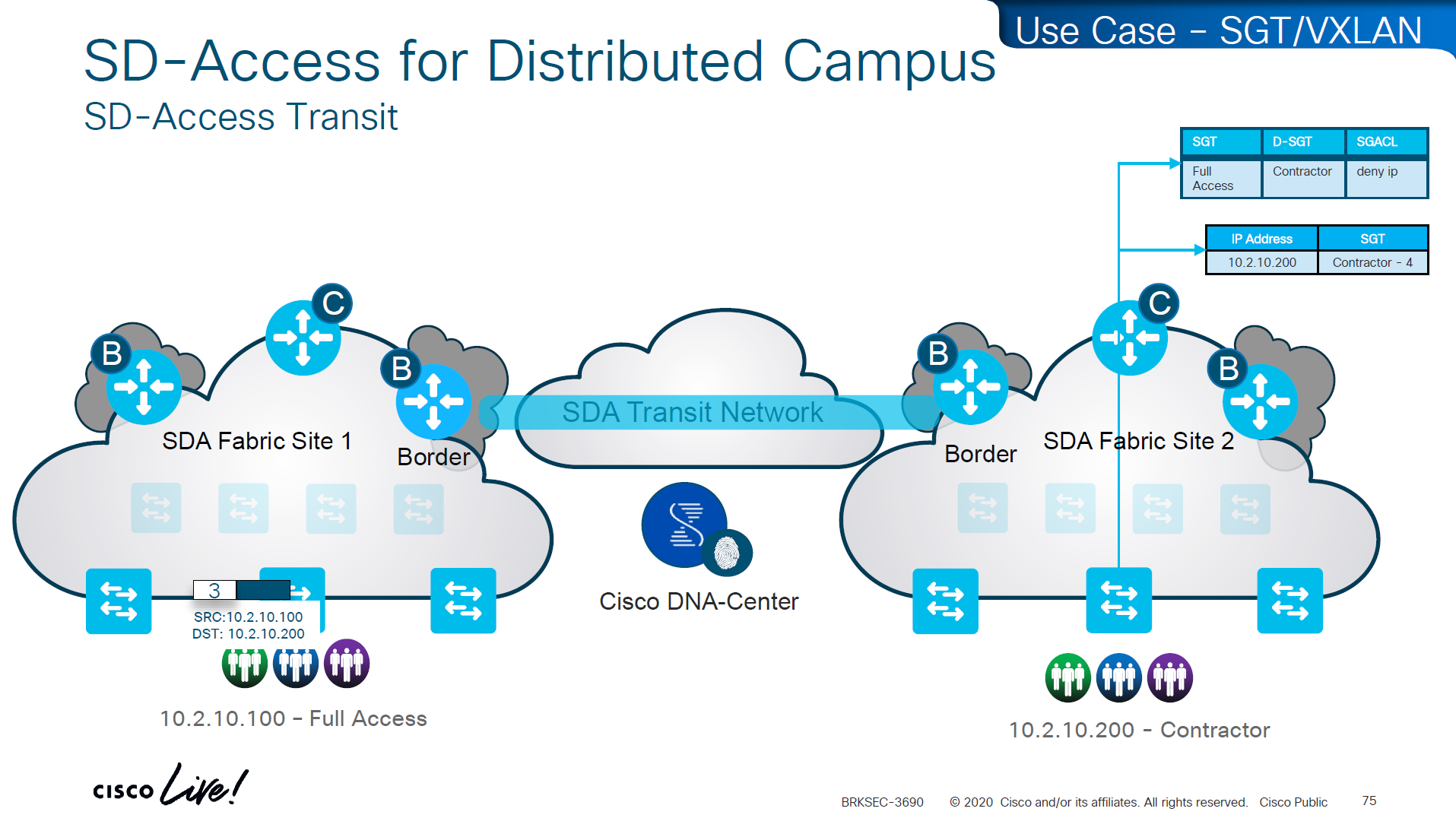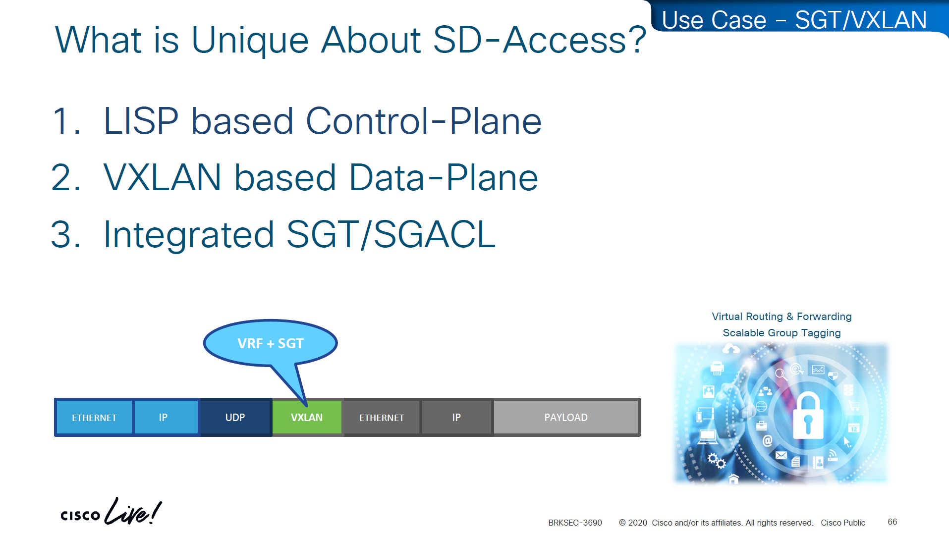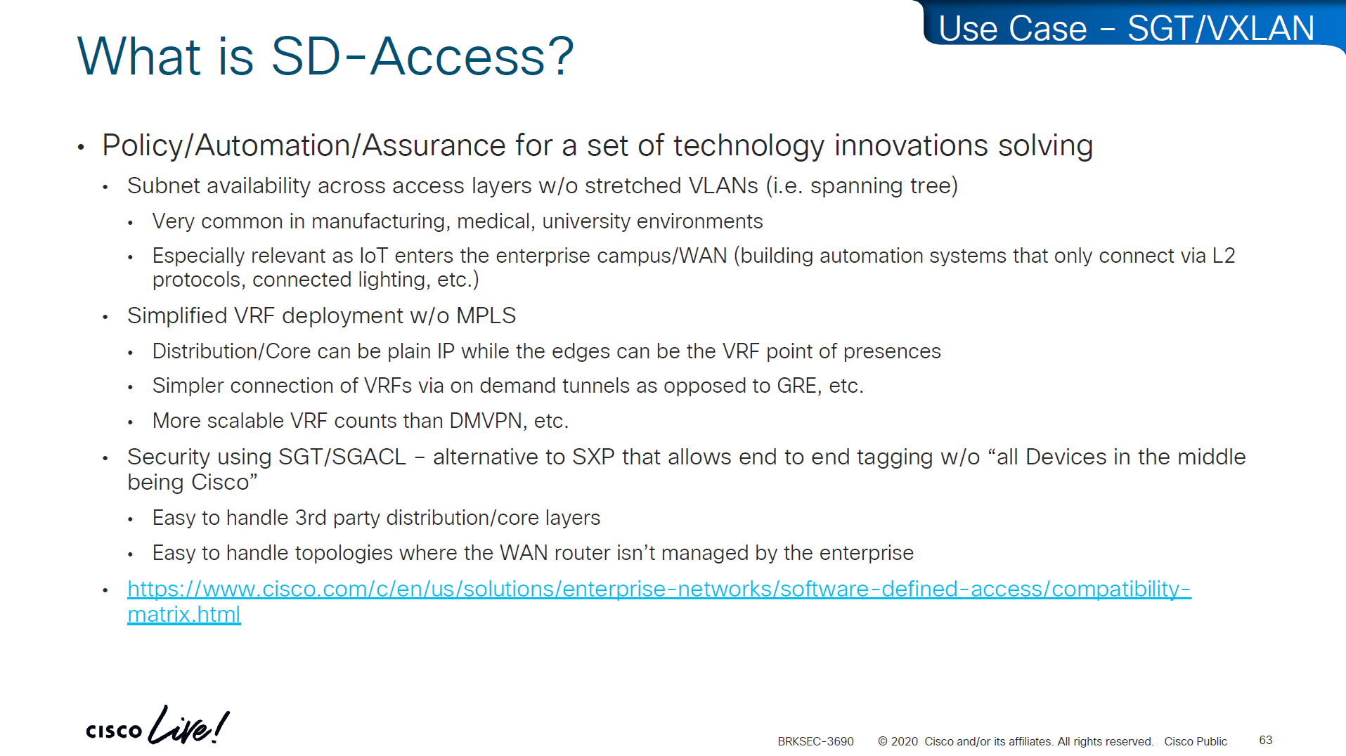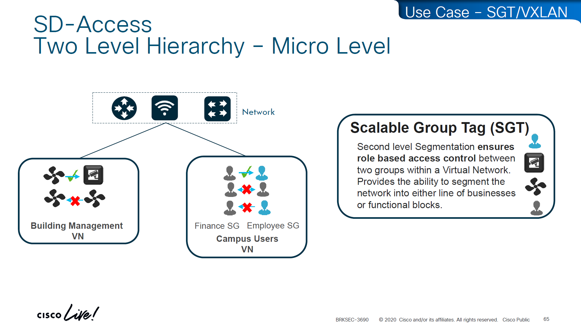 SGTs are used in Cisco TrustSec / SD-Access environments to create role-based access control policies that don’t rely on IP addresses.