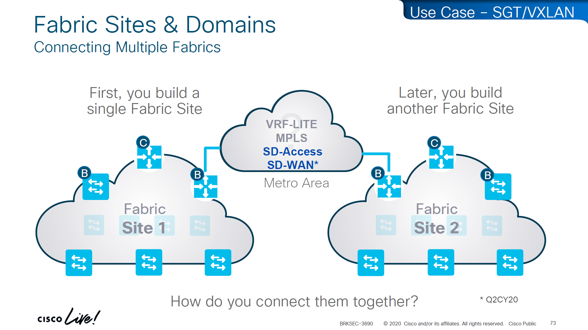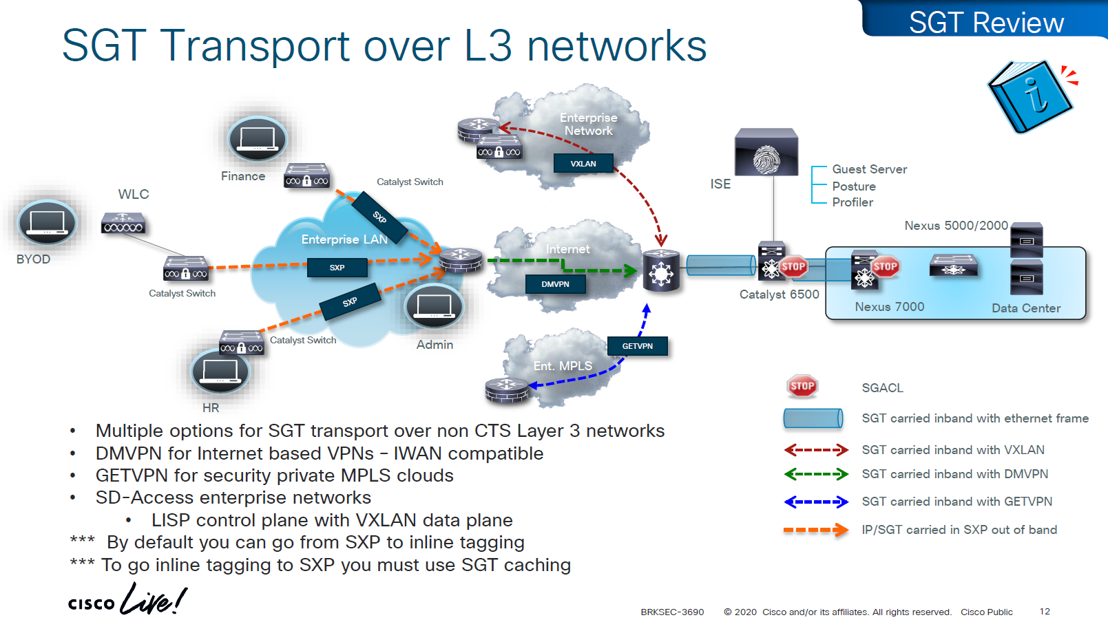 No packet tagging, but use control plane, using SXP (Scalable Group Exchange) protocol to teach foreign devices about the IP to SGT over TCP control plane
