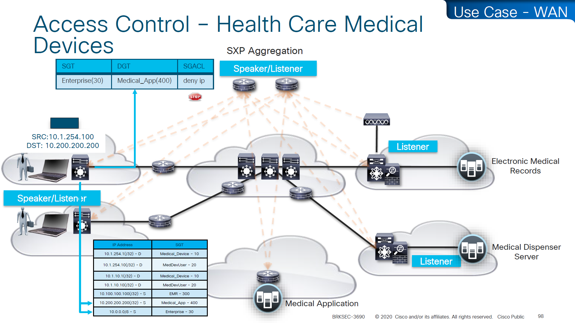 -medical devices and servers are assigned SGT and allowed to speak to one another