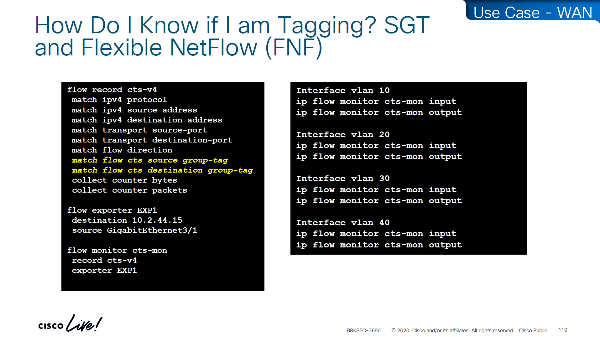 If you want to know that you are tagging traffic, simply turn on netflow with cts with above commands and even if you dont export that flow anywhere, we can see local cache , great for tshoot