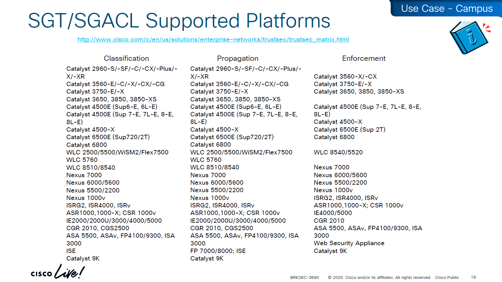 Be careful of platform support for SGT when implementing to make sure that platform does support trustsec for all actions such as Classification, Propagation and Enforcement