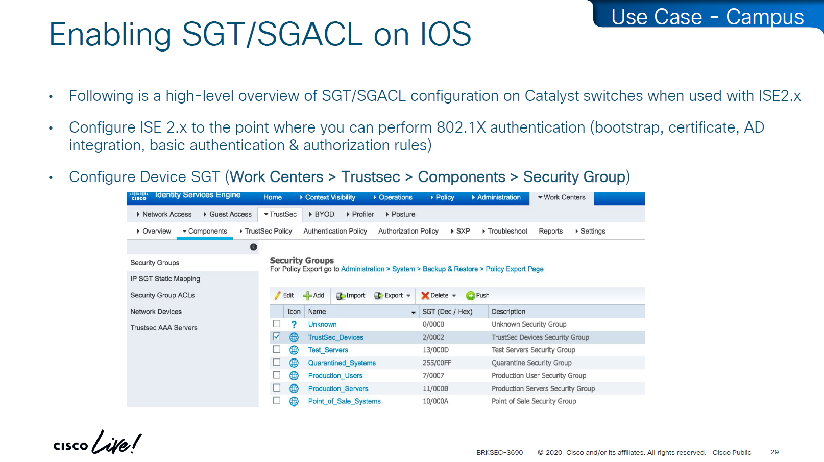 Before SGT/SGACL can be enabled on Cisco devices, make sure that SGT tag for network devices TrustSec_Devices is assigned by default to the network device and make a policy that always allows TrustSec_Devices is always allowed to speak to ISE and infrastructure, why is that needed? because there is a default rule in policy, if it is set to deny then all control plane traffic from device to ISE will be dropped